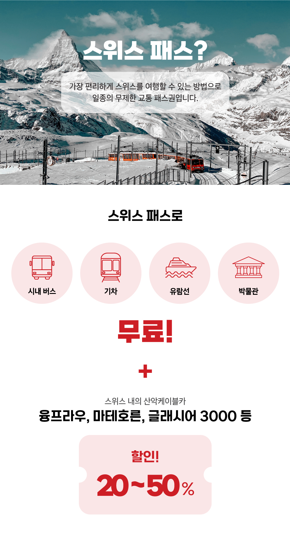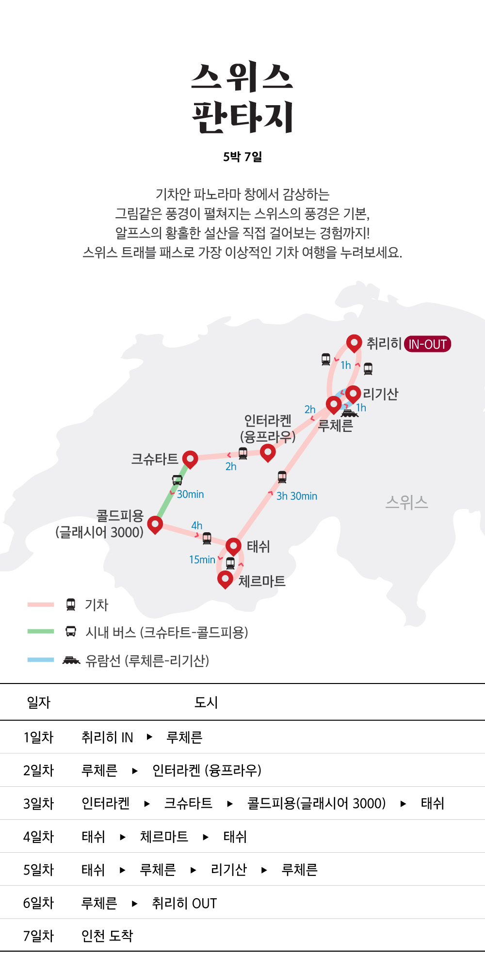 • ✔ 약 50만원 상당 스위스 패스로 버스, 기차, 유람선, 주요 관광지 입장
