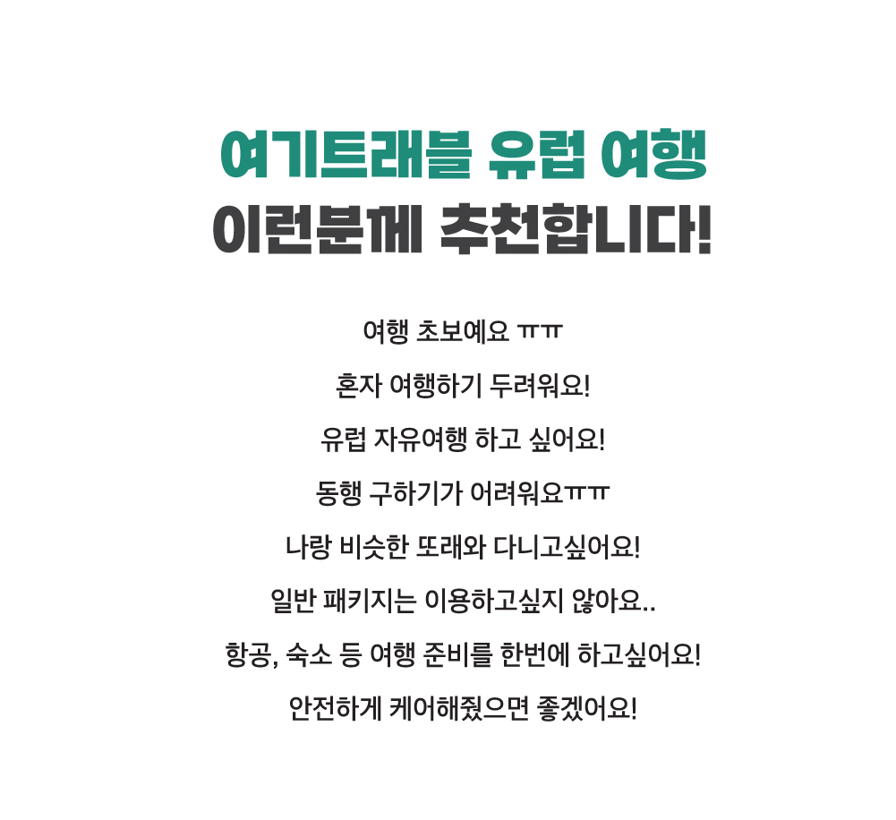 • [항공권 안내] · 추천항공 정보는 '출발확정'시에 안내해드리겠습니다. (안내 전 미리 발권하신 분들에 대해서는 일정 취소 혹 변경 시 책임 지지 않습니다.) · 개별 항공권을 여기트래블에게 부탁할 경우, 추천하는 항공으로 예약 가능하도록 대행사를 안내해드리고 있습니다. · 항공권은 카드결제가 가능합니다. · 추천 항공은 필수가 아닙니다. 개별적으로 항공권 구매가능합니다. · 항공은 기본적으로 1회 경유하는 항공을 이용하며, 신청 순서대로 항공 작업이 진행됩니다. · 항공 단체권의 경우 마일리지 적립이 불가능합니다. [추천항공은 어떻게 배정되나요?] 유럽의 경우 보통 직항으로 가는 국내항공사와 경유하는 외항사로 이루어지는데, 아무래도 직항으로 가는 국내 항공사에 비해 외항사 가격이 저렴하게 책정이 됩니다. 시즌에 따라 다르지만 보통 40만 원 이상의 차이가 나는 편인데요. 여행자분들의 항공권 구매 부담을 줄여드리고자 외국국적항공사를 주로 추천항공으로 배정하는 편입니다. 기본적으로 괜찮은 외항사의 가격과 운항 스케줄 등을 꼼꼼히 살펴본 후 알려드리고 있습니다.