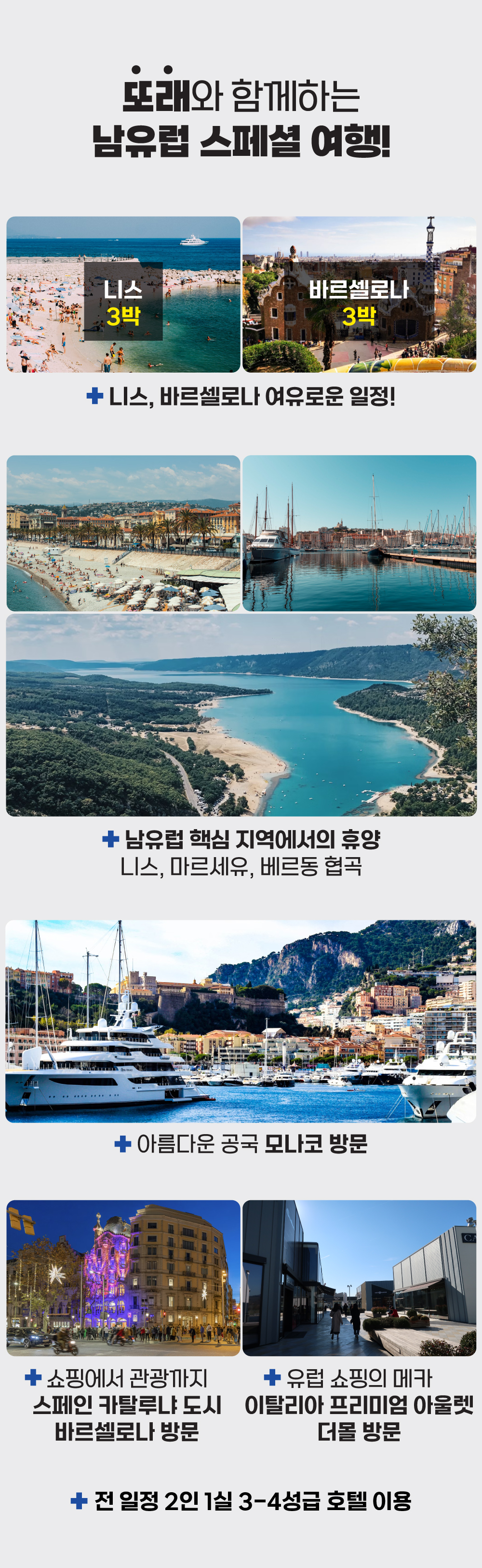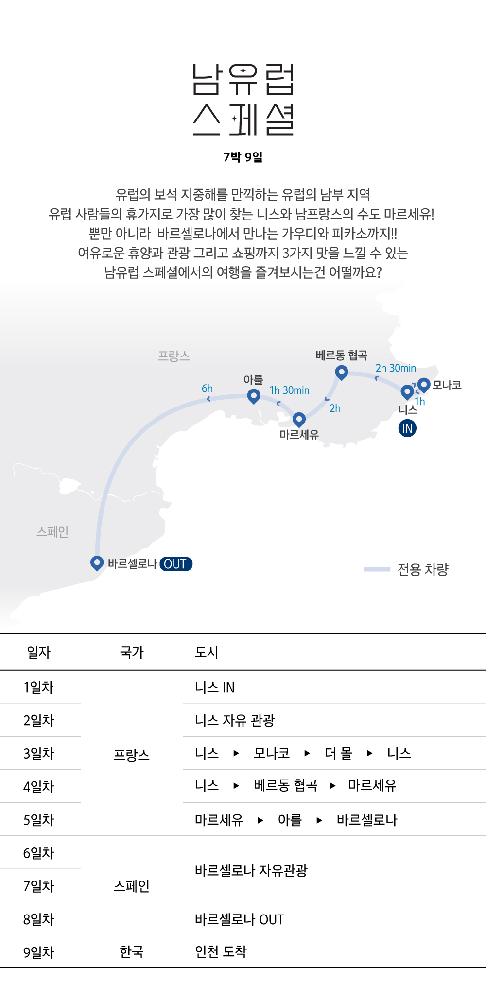 여유로운 휴양과 관광 그리고 쇼핑까지 3가지 맛을 느낄 수 있는 남유럽 스페셜에서의 여행을 즐겨보시는건 어떨까요?