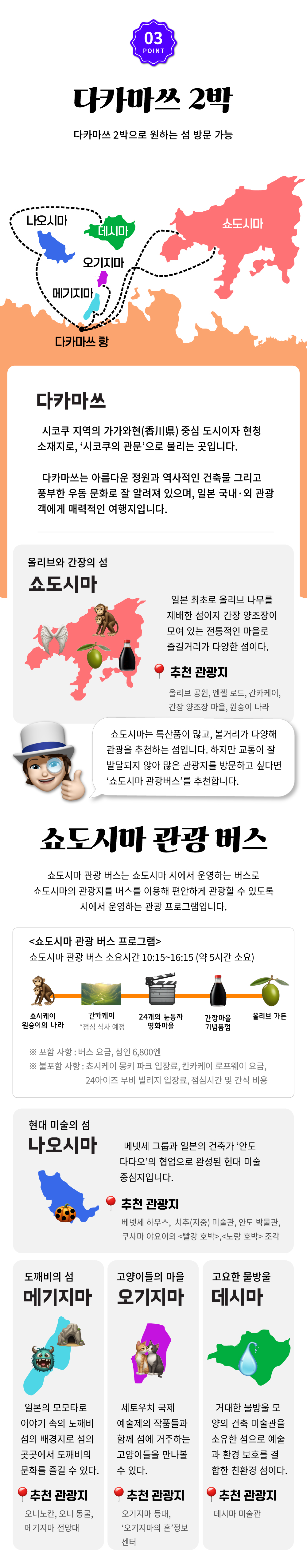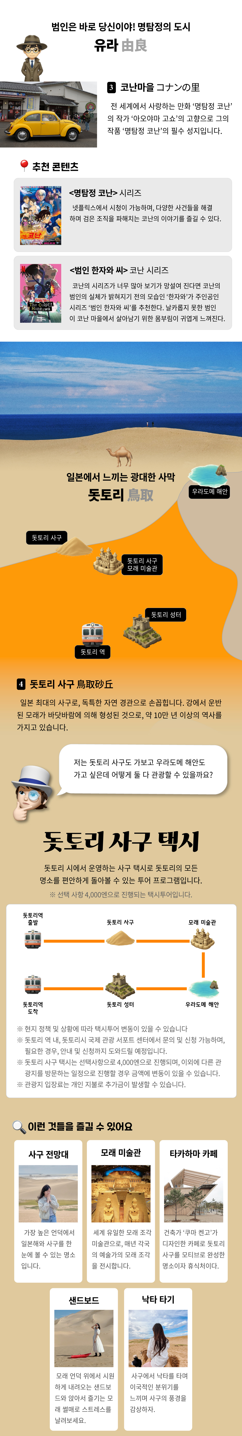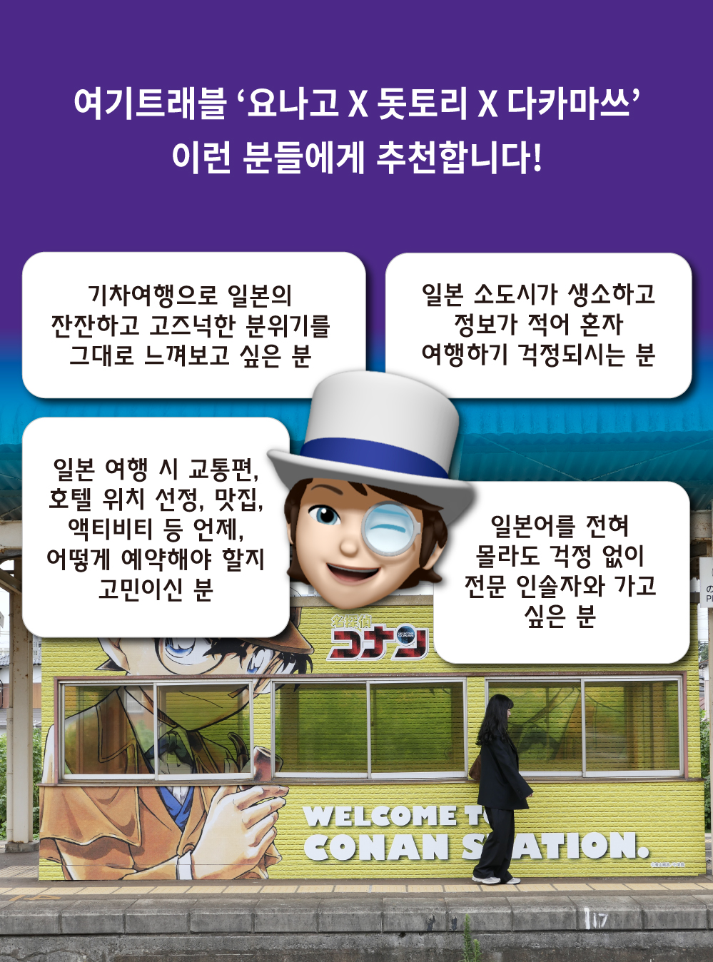 📢 여행 일정 4박 5일 ✅9월 1차: 26년 9/23(수)~9/27(화) 📅연차 1개 ✅10월 1차: 26년 10/9(금)~10/13(화)📅연차 2개 📍방문도시👉🏻 요나고(1) – 가이케 온전 마을 - 유라 - 돗토리(1) – 다카마쓰(2) - 요나고 택시 투어로 미즈키 시게루 로드까지 한번에 방문 - 돗토리에서 코난 덕질과 돗토리 사구 택시 투어까지! - 다카마쓰 2박으로 다양한 테마의 섬들 방문! * 괄호 안의 숫자는 숙박일 수 입니다. * 방문 도시는 상세 페이지 내 일정표를 참고하세요. 💁🏻모집대상 26년 출발 여행👉🏻 07년생 - 87년생 ⭐커플가능⭐ 🎁 혜택 ✅ 재참여 5만원 할인 ✅ 군인 5만원 할인 ✅ 26학년도 수험생 5만원 할인 ✅ 동반신청 각각 5만원 할인