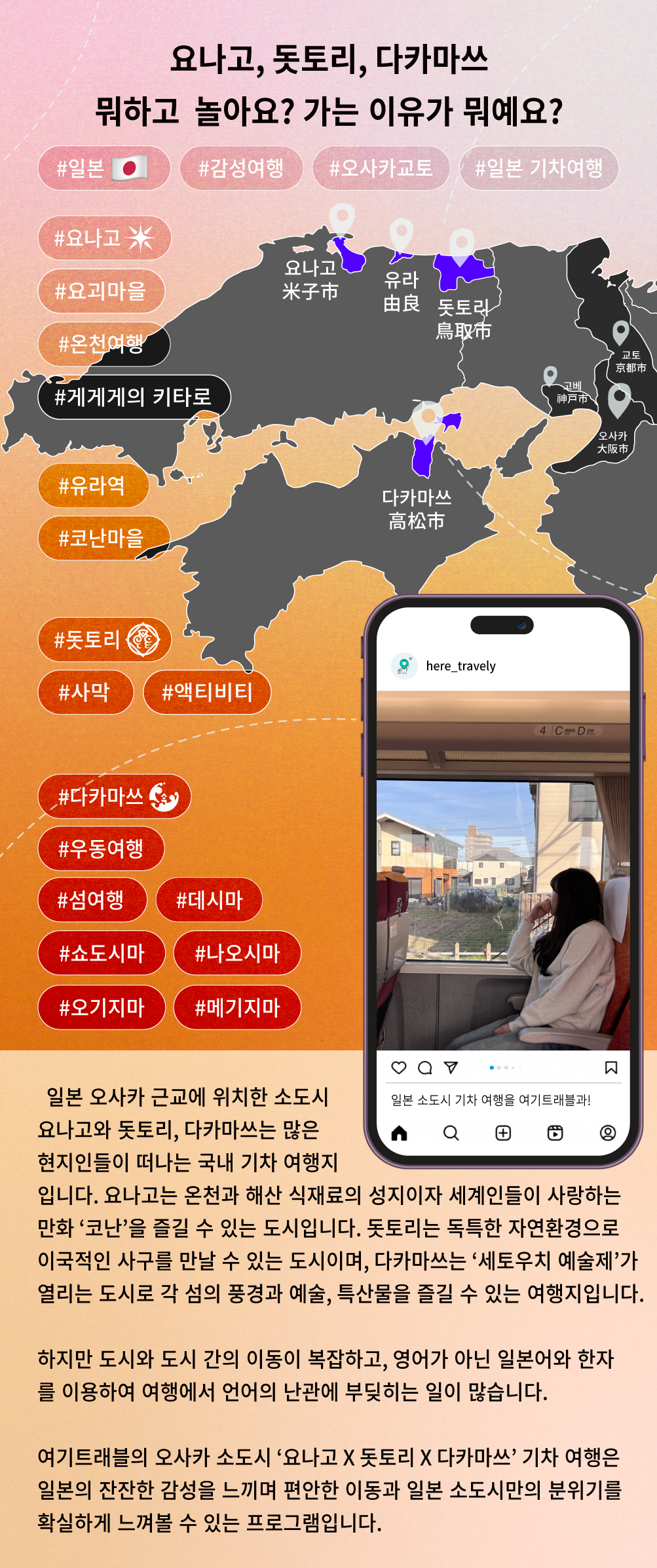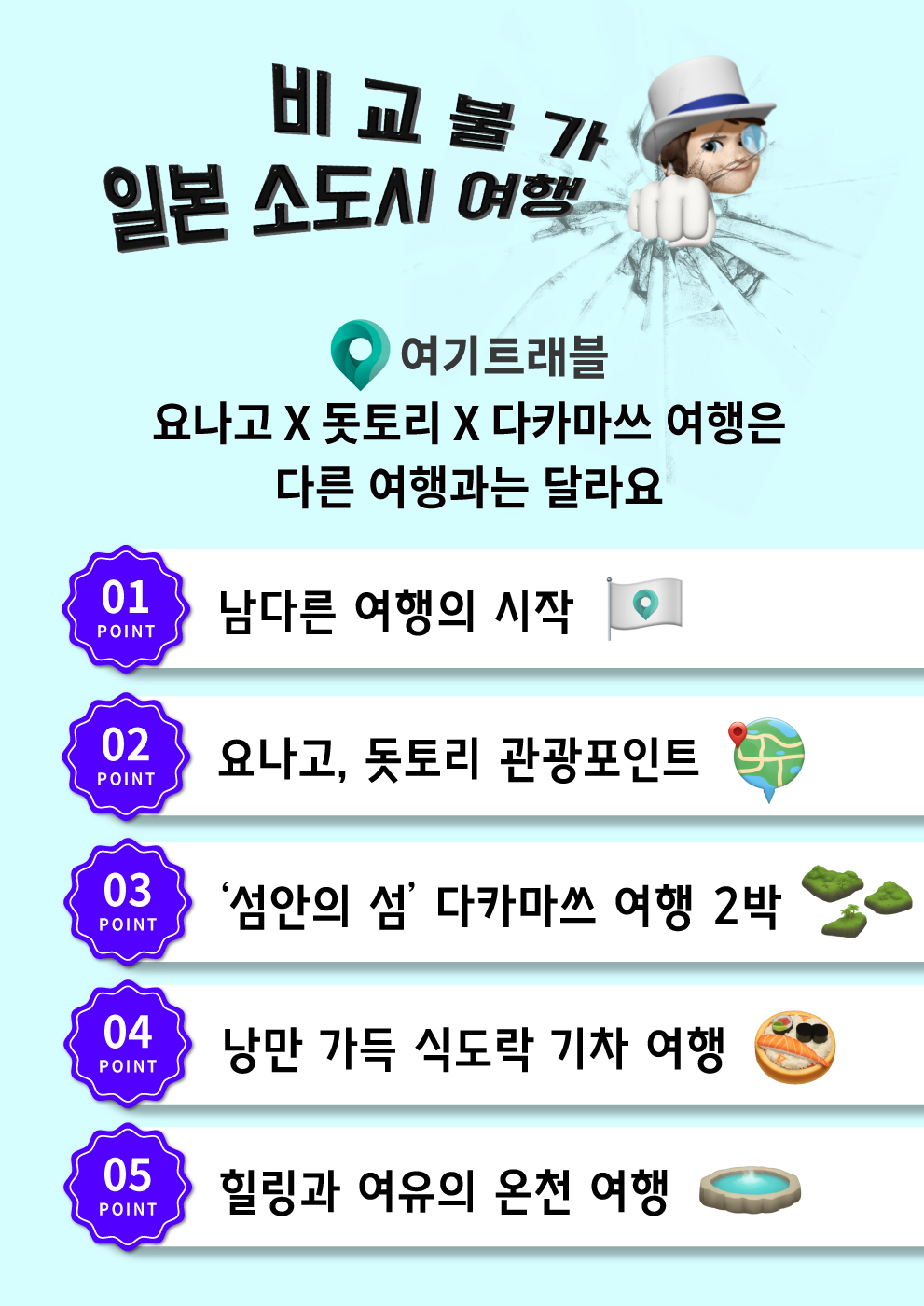 안녕하세요! 여기트래블입니다 😊 혼자 가기 망설여졌던 소도시들을 알차게 즐기셨다니 정말 다행이에요! 돗토리, 요나고, 다카마쓰의 한적하고 감성 가득한 분위기를 함께 느끼셨다니 저희도 뿌듯합니다 🍃 앞으로도 여유롭고 감성 가득한 여행, 여기트래블이 함께하겠습니다 💙 소중한 후기 감사드립니다!