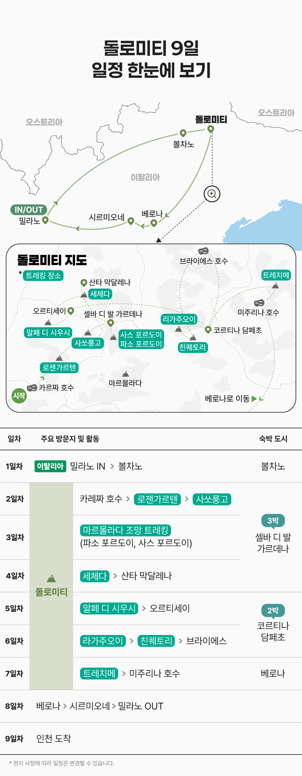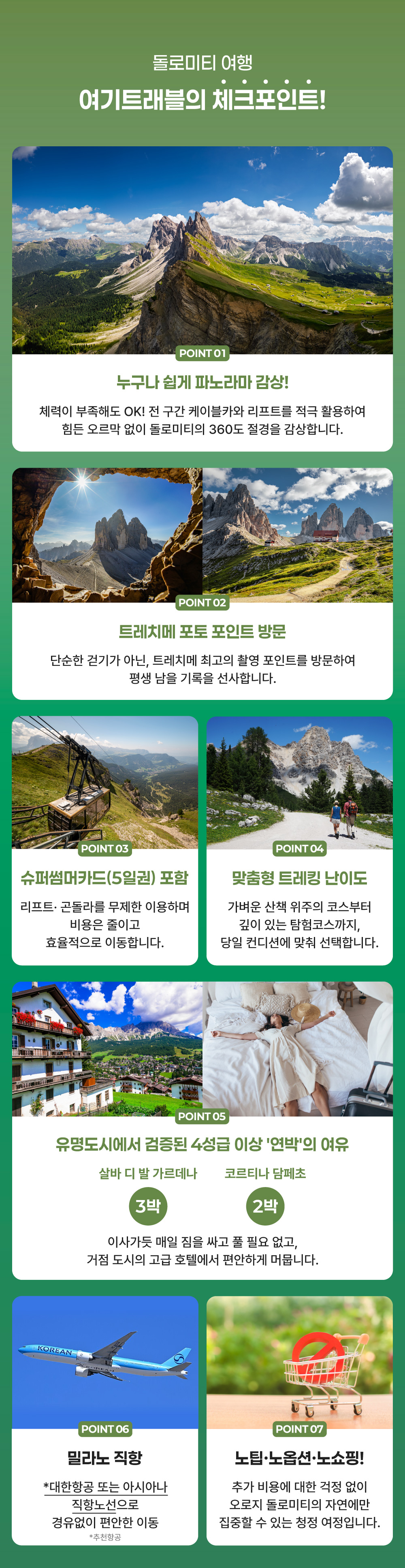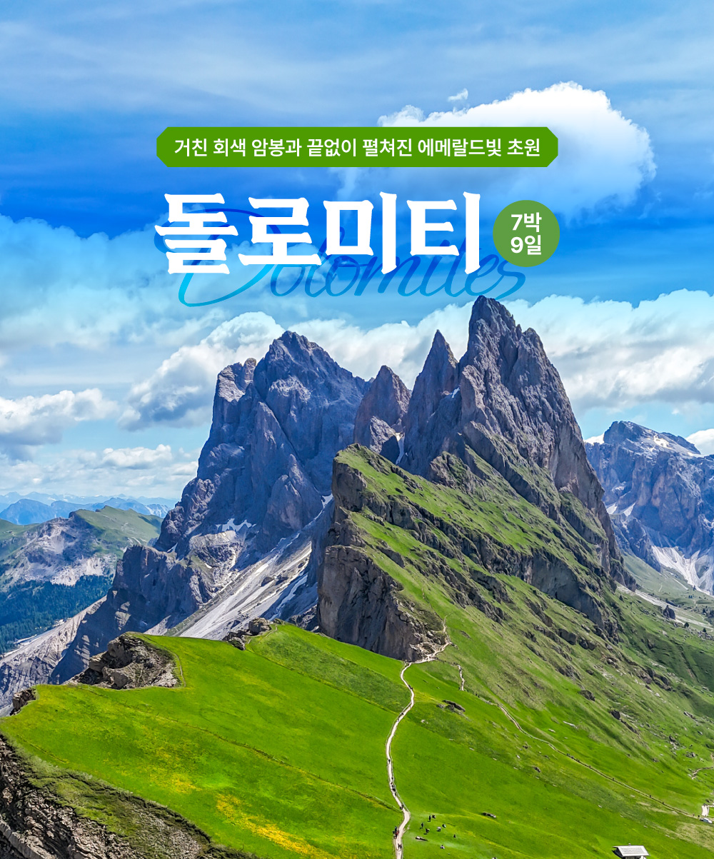 📢 여행 일정 7박 9일 ✅6월 1차: 26년 6/26(금)~7/4(토) ✅7월 1차: 26년 7/17(금)~7/25(토) ✅8월 1차: 26년 8/28(금)~9/5(토) 📍방문도시👉🏻 밀라노 – 볼차노 – 카레짜 호수 – 로젠가르텐 – 사쏘룽고 – 발가르데나(3) – 마르몰라다 – 세체다 – 산타 막달레나 – 알페 디 시우시 – 오르티세이 – 코르티나 담 페초(2) – 라가주오이 – 친퀘토리 – 브라이에스 호수 – 트레치메 – 미주리나 호수 – 베로나 – 시르미오네 - 케이블카·차량 이동 중심 체력 부담 최소화 - 인천 직항 + 프리미엄 호텔 4성급 이상+3연박 - 하루 1~2개 코스, 개별 체력에 맞춘 트레킹 또는 피크닉 선택 가능 - 노팁·노옵션·노쇼핑, 여행 본질에 집중 * 괄호 안의 숫자는 숙박일 수 입니다. * 방문 도시는 상세 페이지 내 일정표를 참고하세요. ✅누구나 쉽게 파노라마 감상! ✅트레치메 포토 포인트 방문 ✅슈퍼 썸머카드(5일권) 포함 ✅맞춤형 트레킹 난이도 선택 ✅유명 도시에서 검증된 4성급 이상 '연박'의 여유 ✅밀라노 직항 ✅노팁,노옵션,노쇼핑! 💁🏻모집대상 26년 출발 여행👉🏻 07년생 - 87년생 ⭐커플가능⭐ 🚐8~14명 밴차량 진행(신청 인원 15명 이상 시 버스 변경) ⏰ 이벤트👉🏻 얼리버드 선착순 50만원 할인(항공권 불포함) 🎁 혜택 ✅ 재참여 10만원 할인 ✅ 군인10만원 할인 ✅ 26학년도 수험생 10만원 할인 ✅ 동반신청 각각 5만원 할인