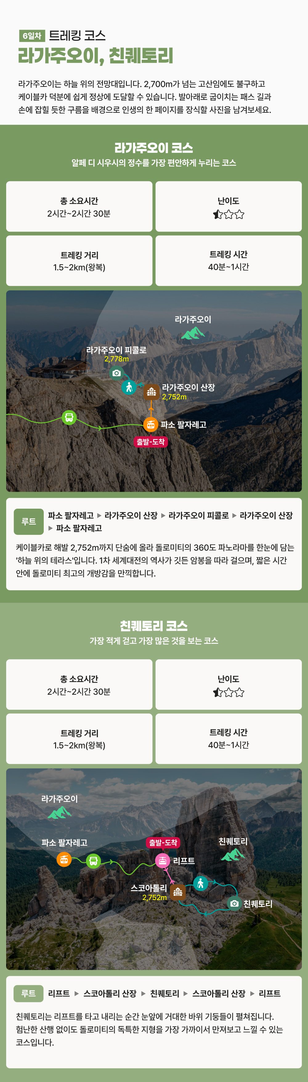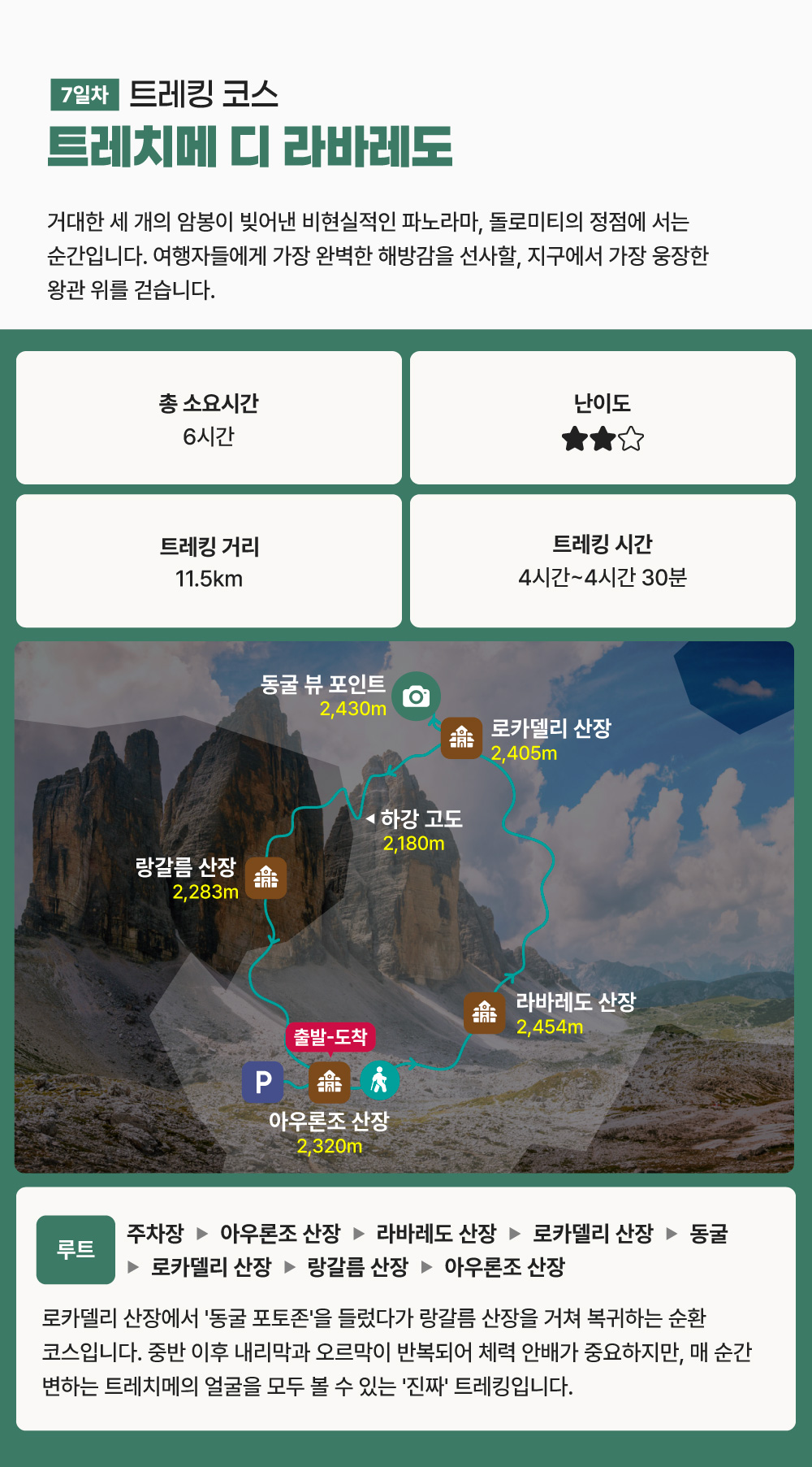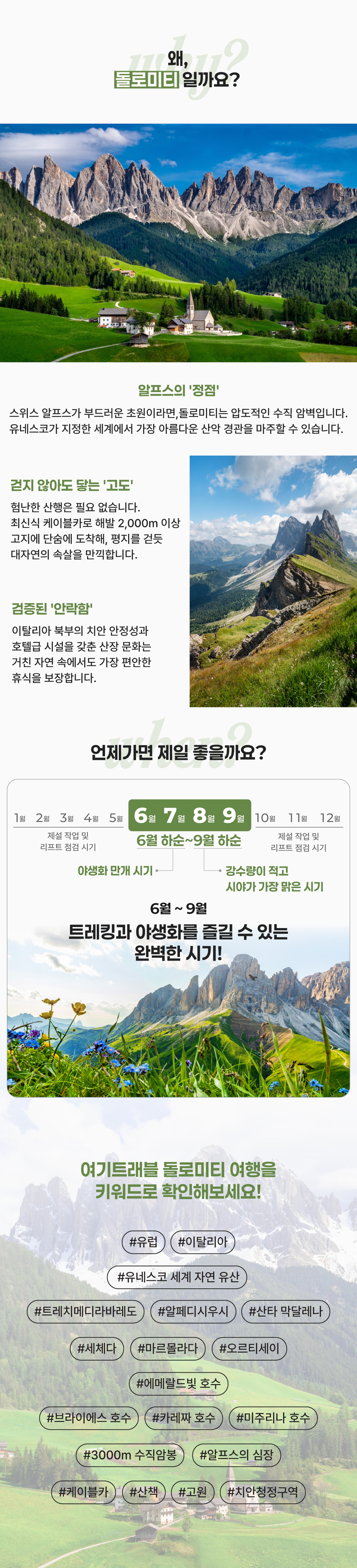 📢 여행 일정 7박 9일 ✅6월 1차: 26년 6/26(금)~7/4(토) ✅7월 1차: 26년 7/17(금)~7/25(토) ✅8월 1차: 26년 8/28(금)~9/5(토) 📍방문도시👉🏻 밀라노 – 볼차노 – 카레짜 호수 – 로젠가르텐 – 사쏘룽고 – 발가르데나(3) – 마르몰라다 – 세체다 – 산타 막달레나 – 알페 디 시우시 – 오르티세이 – 코르티나 담 페초(2) – 라가주오이 – 친퀘토리 – 브라이에스 호수 – 트레치메 – 미주리나 호수 – 베로나 – 시르미오네 - 케이블카·차량 이동 중심 체력 부담 최소화 - 인천 직항 + 프리미엄 호텔 4성급 이상+3연박 - 하루 1~2개 코스, 개별 체력에 맞춘 트레킹 또는 피크닉 선택 가능 - 노팁·노옵션·노쇼핑, 여행 본질에 집중 * 괄호 안의 숫자는 숙박일 수 입니다. * 방문 도시는 상세 페이지 내 일정표를 참고하세요. ✅누구나 쉽게 파노라마 감상! ✅트레치메 포토 포인트 방문 ✅슈퍼 썸머카드(5일권) 포함 ✅맞춤형 트레킹 난이도 선택 ✅유명 도시에서 검증된 4성급 이상 '연박'의 여유 ✅밀라노 직항 ✅노팁,노옵션,노쇼핑! 💁🏻모집대상 26년 출발 여행👉🏻 07년생 - 87년생 ⭐커플가능⭐ 🚐8~14명 밴차량 진행(신청 인원 15명 이상 시 버스 변경) ⏰ 이벤트👉🏻 얼리버드 선착순 50만원 할인(항공권 불포함) 🎁 혜택 ✅ 재참여 10만원 할인 ✅ 군인10만원 할인 ✅ 26학년도 수험생 10만원 할인 ✅ 동반신청 각각 5만원 할인