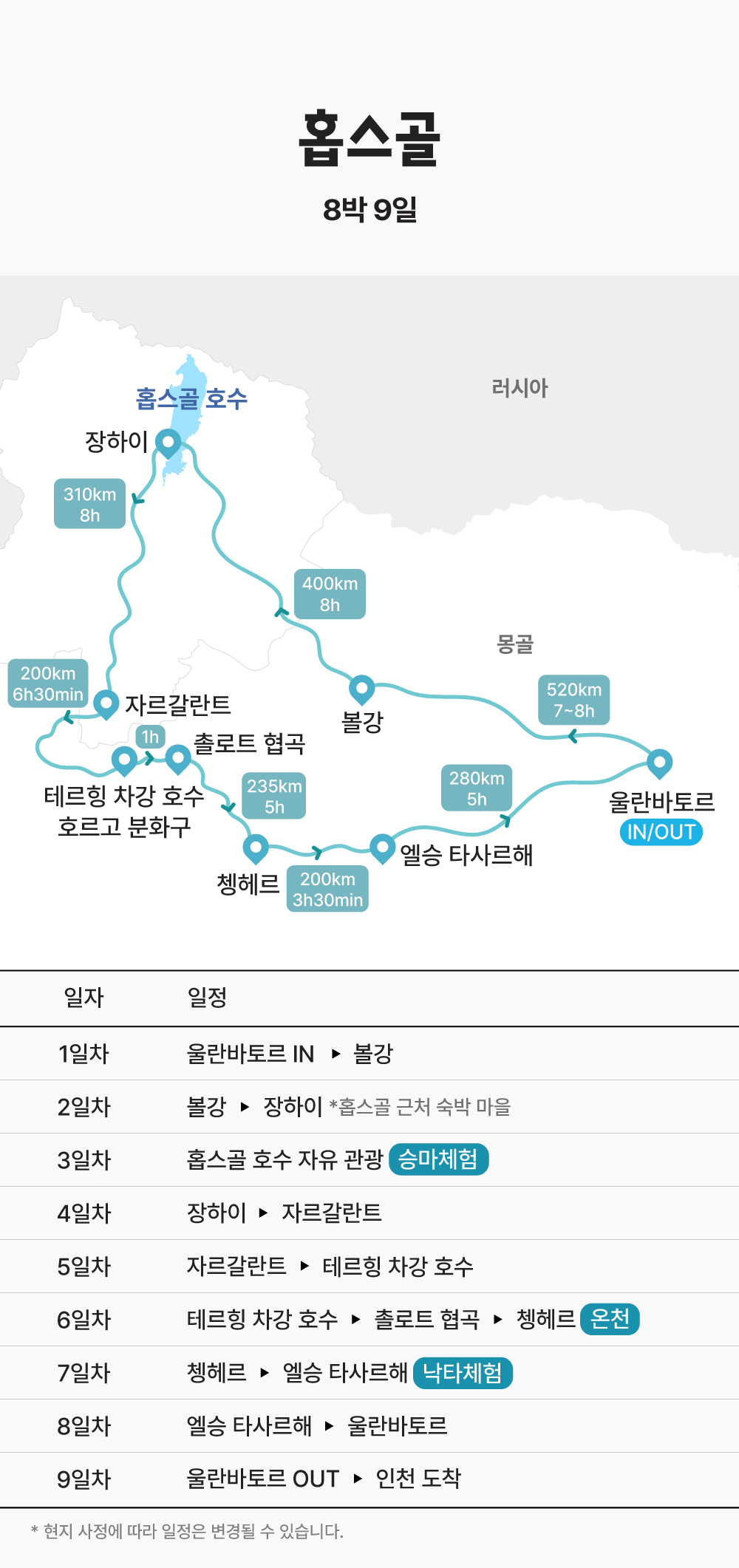 · 일정 및 출발일은 항공 사정 및 현지 사정에 의해 조금 변경될 수 있습니다.