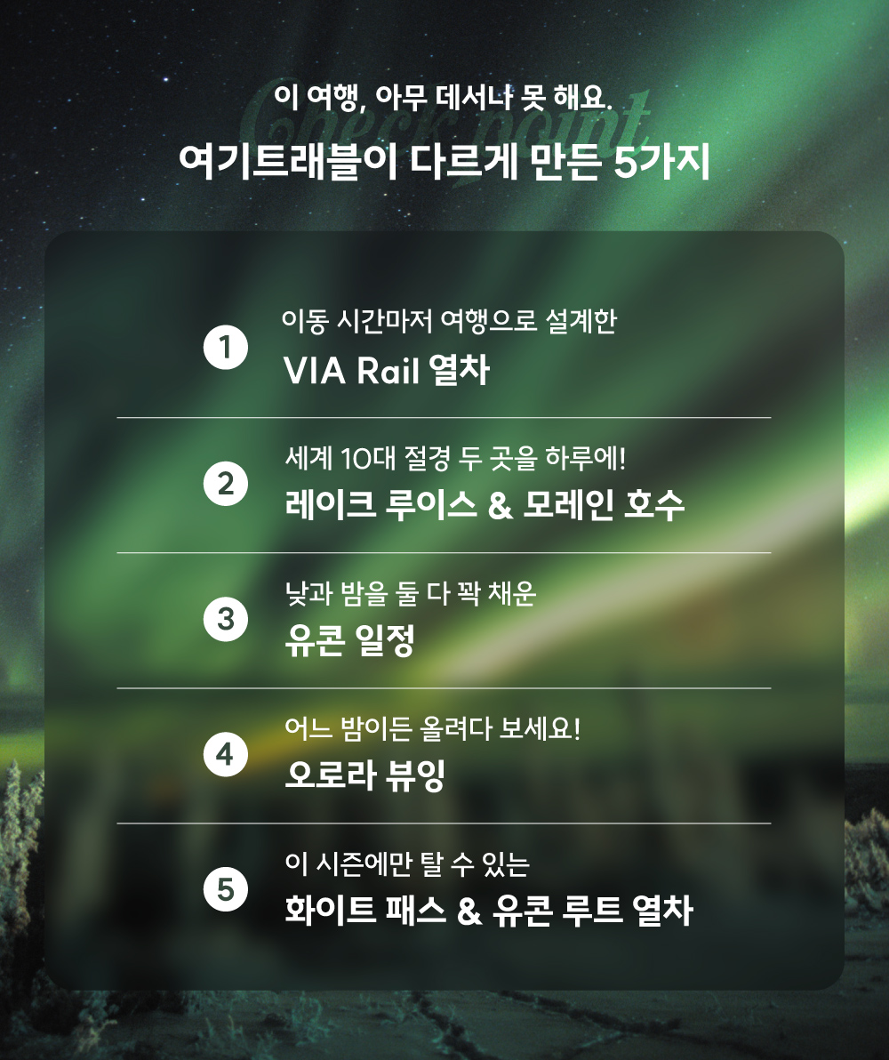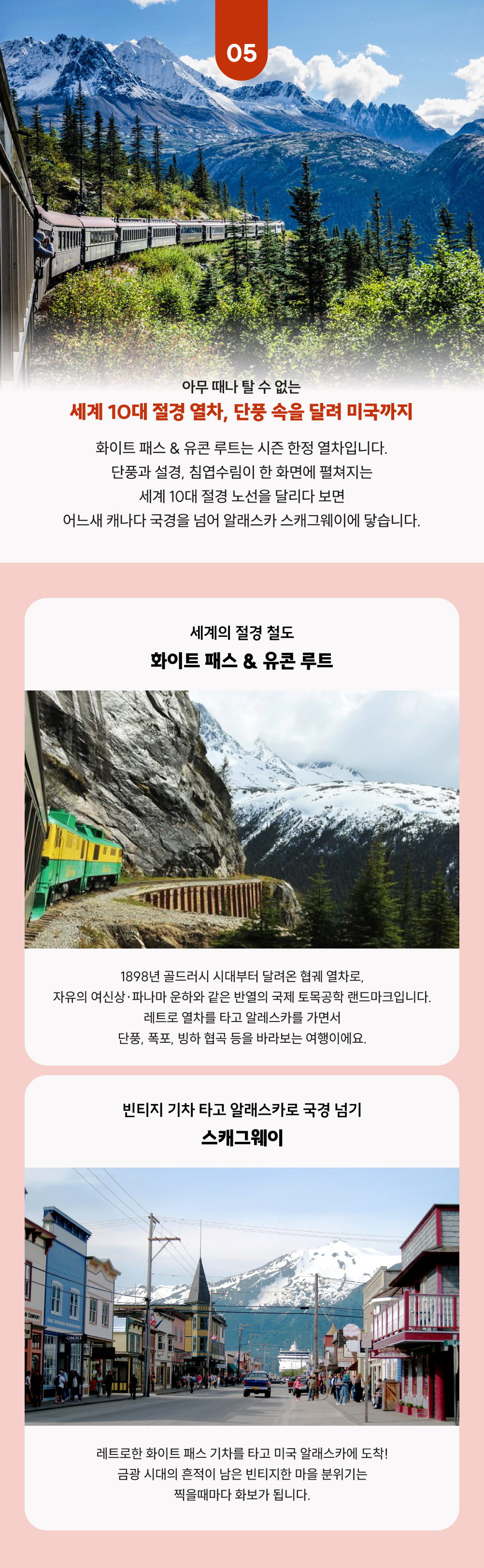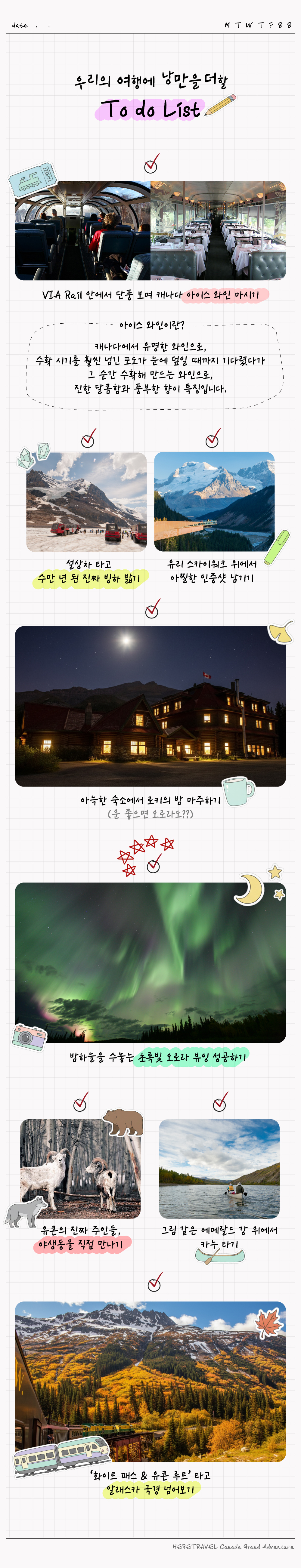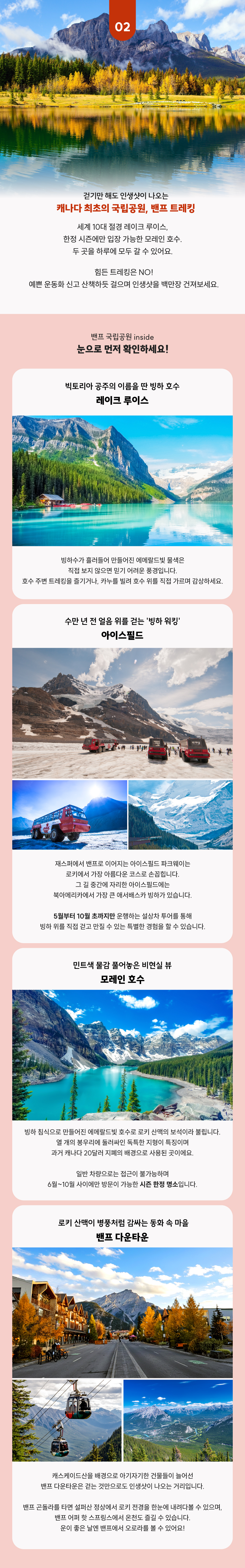 📢 여행 일정 8박 10일 ✅8월 1차: 26년 8/27(목)~9/5(토) ✅9월 1차: 26년 9/3(목)~9/12(토) ✅9월 2차: 26년 9/10(목)~9/19(토) ✅9월 3차: 26년 9/17(목)~9/26(토) ✅9월 4차: 26년 9/24(목)~10/3(토) ✅10월 1차: 26년 10/1(목)~10/10(토) 📍방문도시👉🏻 밴쿠버(1) - 비아레일(1) - 재스퍼 - 아이스필드 - 레이크 루이스(1) - 모레인 호수 - 밴프(2) - 화이트호스(3) - 단풍과 오로라를 볼 수 있는 찰나의 여행지 - 캐나다 유명 도시 및 국립 공원 방문 - 파노라마 뷰가 있는 기차 여행 * 괄호 안의 숫자는 숙박일 수 입니다. * 방문 도시는 상세 페이지 내 일정표를 참고하세요. 💁🏻모집대상 26년 출발 여행👉🏻 07년생 - 87년생 ⭐커플가능⭐ 🎁 혜택 ✅ 재참여 10만원 할인 ✅ 군인 10만원 할인 ✅ 26학년도 수험생 10만원 할인 ✅ 동반신청 각각 5만원 할인